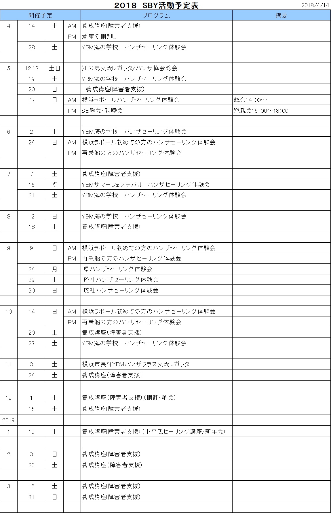 2018年度のスケジュールが確定しました。