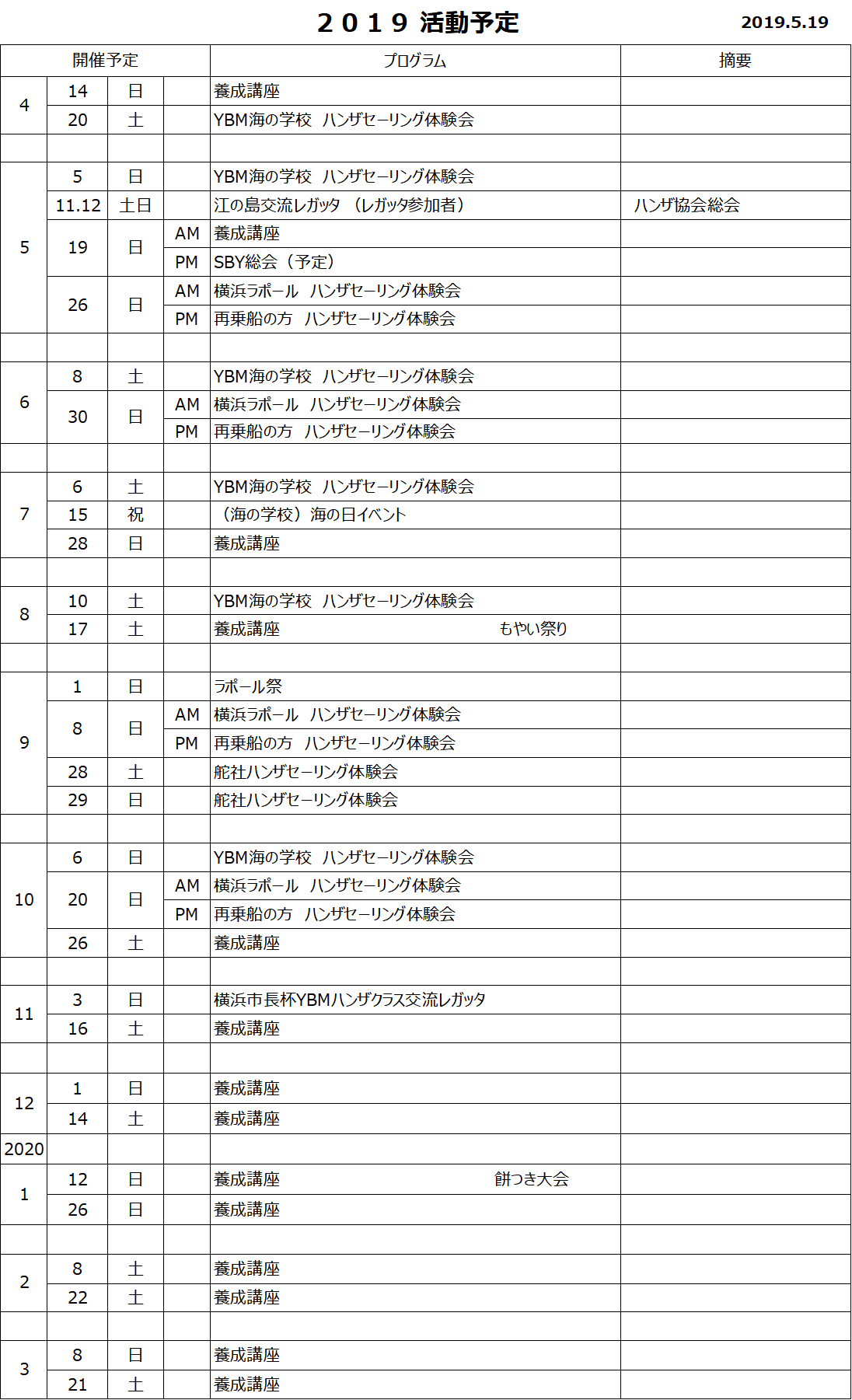 2019年度のスケジュールが確定しました。